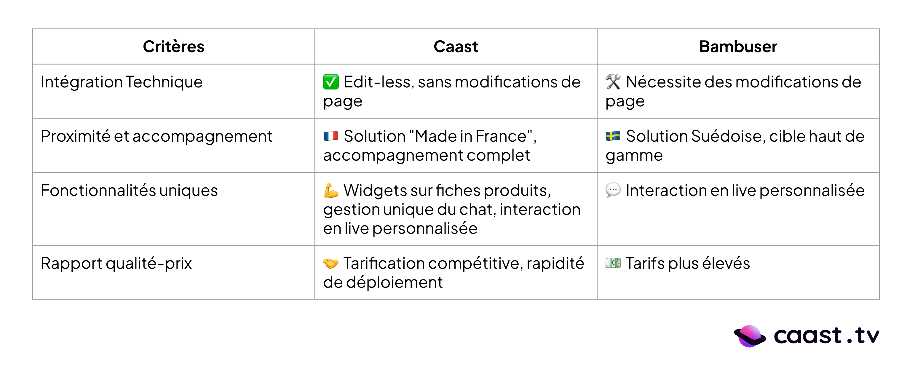 As a French-built solution, Caast targets a broader market thanks to its flexibility and operational agility. Caast provides a turnkey solution that supports you not only on the technical side but also in organizing and producing your live sessions. Beyond its in-house expertise, Caast activates a partner network for influencer sourcing, studio rental, and live production. Its speed of deployment and competitive pricing are additional advantages over the competition.