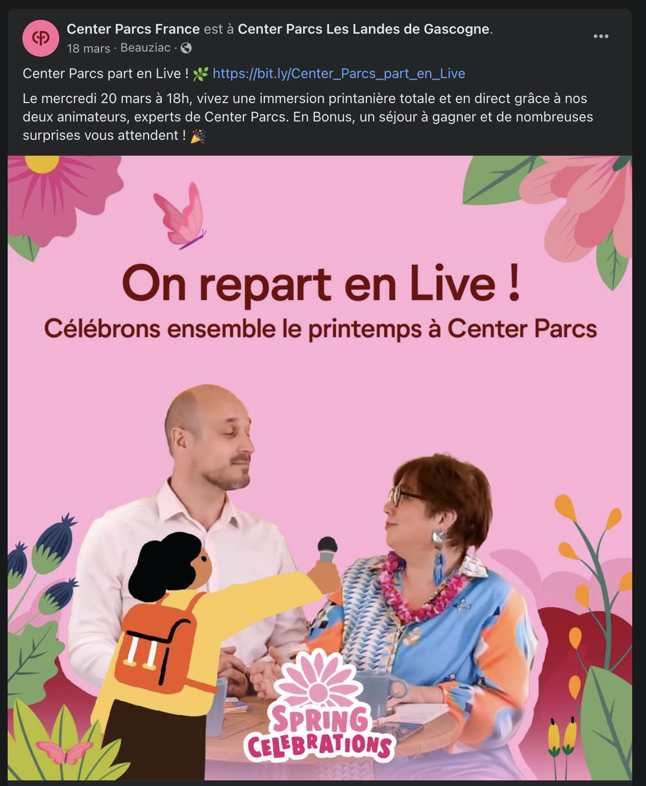 For its March live to mark the start of Spring, Center Parcs engages clients and prospects through social media posts featuring its recurring hosts.