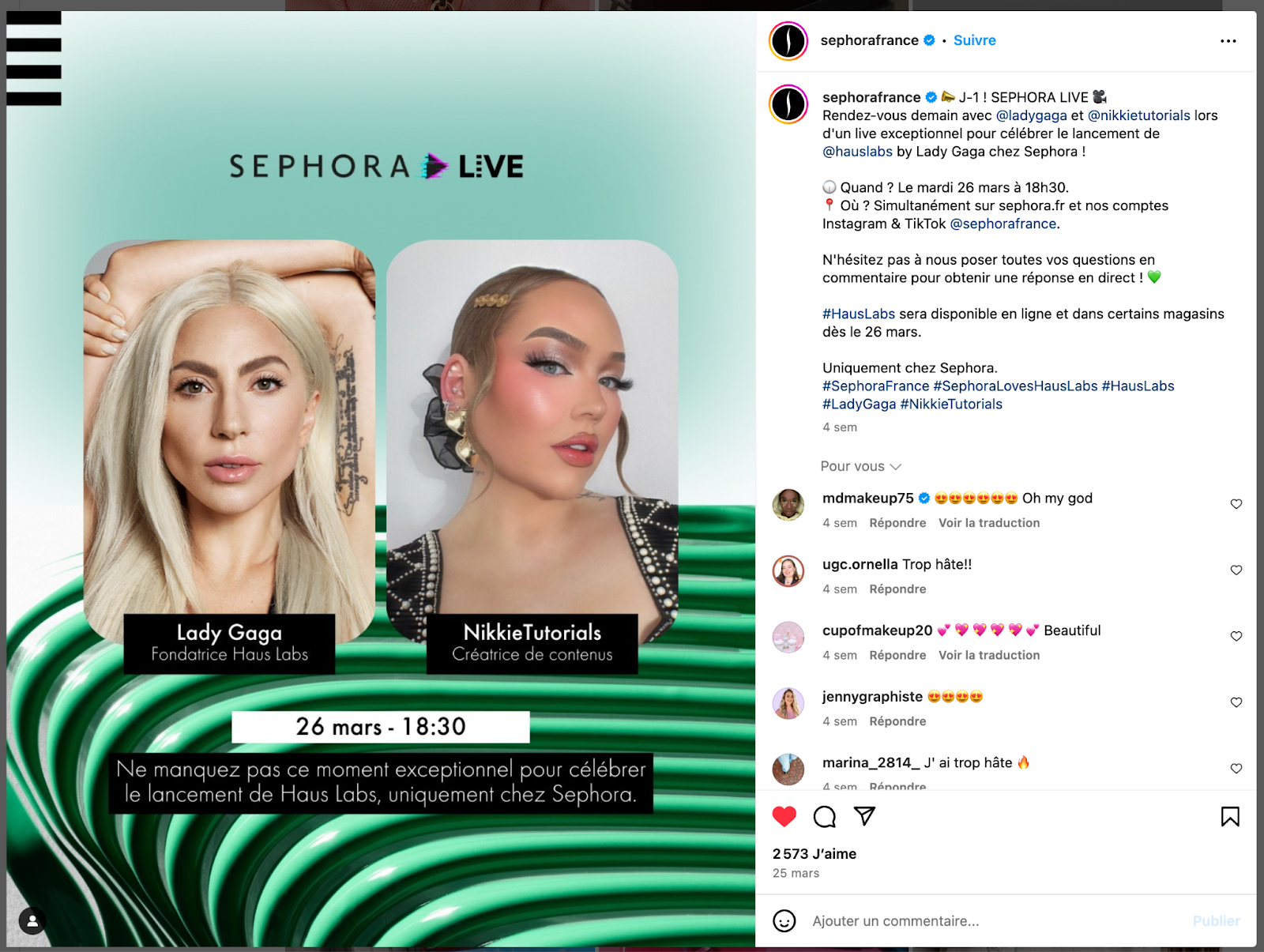The launch of Lady Gaga's brand was promoted by Sephora across its social channels with careful planning: the Live Shopping was scheduled for the day after the brand launch with influencers — including Nikkie Tutorials, who hosted the Live Shopping session.